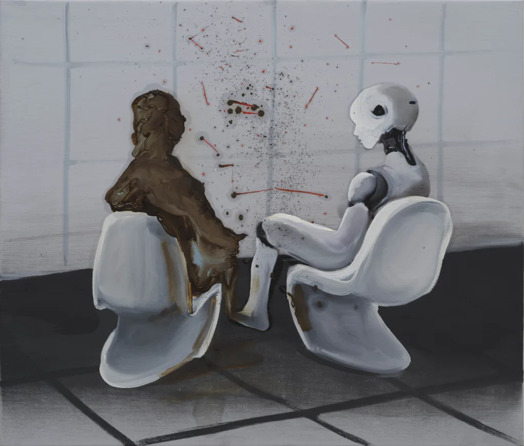 The AI daughter in Daughter B.W.A.S.M is often AI-generated and screenprinted onto the canvases, while “Shit Mom” is painted leaky, streaky, and almost monstrous-looking in comparison. The depictions of light are especially eerie and enchanting, as if glowing from within, like a cellphone illuminated in the dark. In a few works, “Shit Mom” holds a soft, pastel teddy bear; but it’s as if her shittiness rubs off. The teddies are slightly slimy and sloppy, the attempt at care or connection with the ‘daughter’ messier than intended. In another painting, “Shit Mom” makes two AI daughters literally lose their heads. The fallibilities of being human seep like osmosis in D.B.W.A.S.M. (Pink Teddy) (2025) through a screen’s hard black edges into the very structure of the daughter. She looks beautiful, appearing as half tech, half silvery-white dripping liquid, a magical, otherworldly cyborg. She is, in other words, touched.