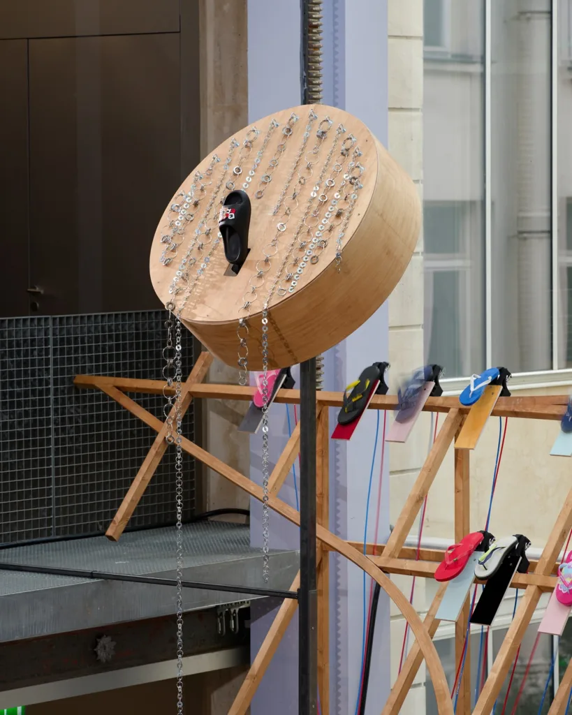 That softness can be deceiving. While the installation is filled with whimsy—sandals flapping like castanets, rhythms echoing through architectural cavities—Sole Crushing invites serious reflection on resistance, migration, collective identity, and the fragility of togetherness in a world increasingly defined by fragmentation. “I’m always drawn to the moment where the personal meets the collective,” Bennani says. “When you’re in a crowd, you stop being entirely yourself. There’s catharsis, but also surrender.”