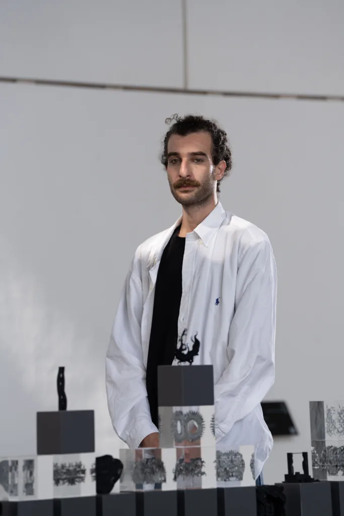 Palestinian artist and architect Ahmad Alaqra’s sculptural installation I remember. a light explores shadow as a medium of memory and preservation. The work is composed of translucent resin cubes arranged on shelves, each containing a 3D form of a shadow digitally modelled from photographs taken by Alaqra in Sharjah and Dubai.