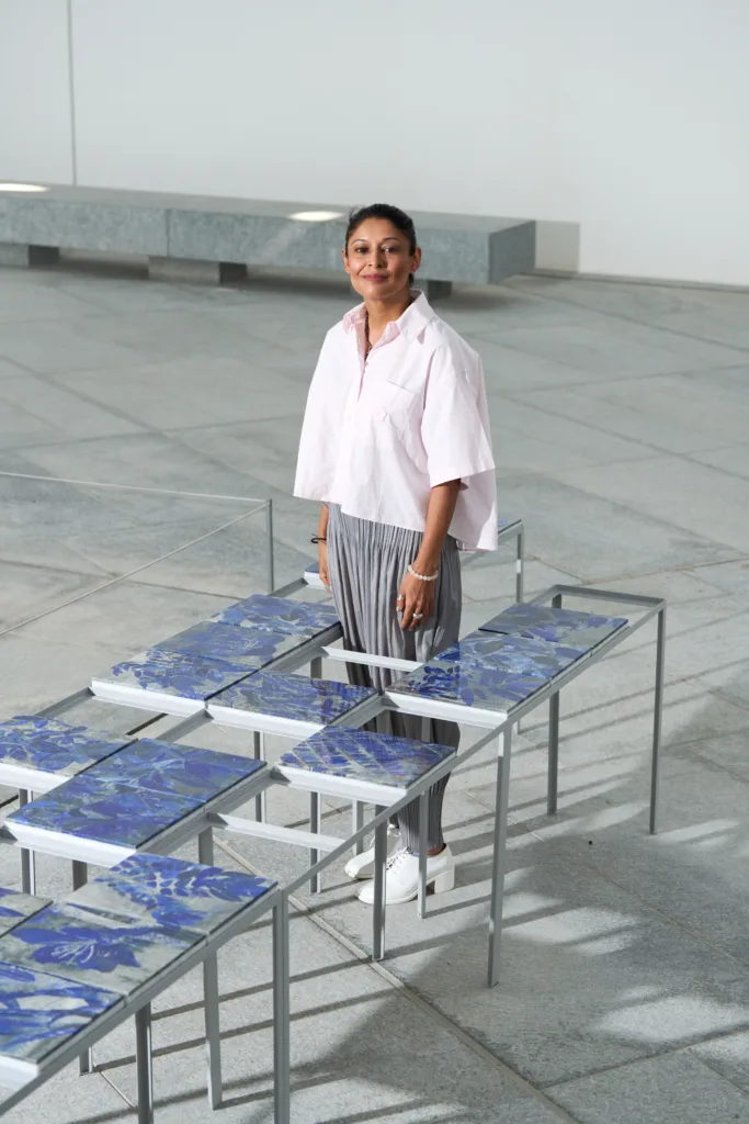 The exhibition opens with Tree Studies, an installation by visual artist Hamra Abbas. Comprising intricate stone inlay sculptures, the work transforms botanical drawings of tree species from the UAE and her native Pakistan into enduring forms. Using her signature technique of lapis inlaid in lapis, Abbas explores the interplay of light and darkness, drawing on the stone’s vivid blue pigment and muted grey tones to evoke the ephemeral silhouettes of foliage.