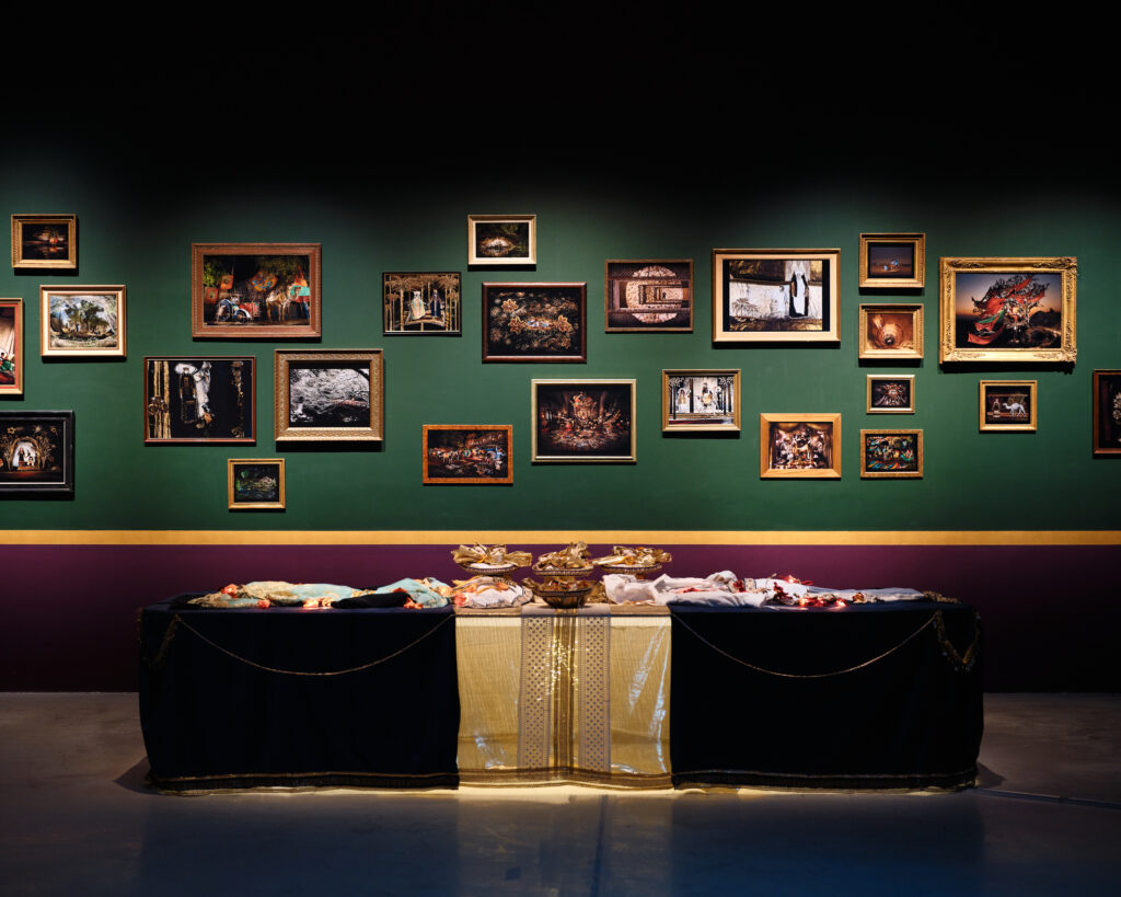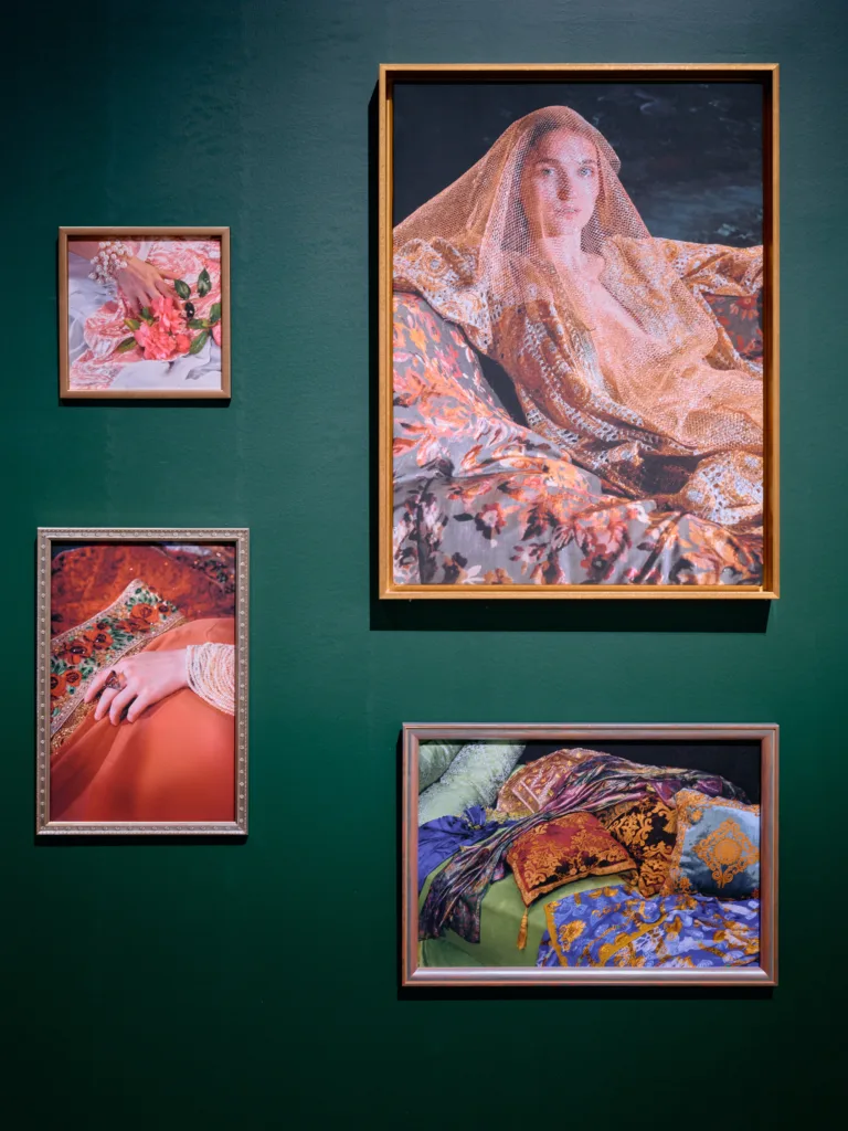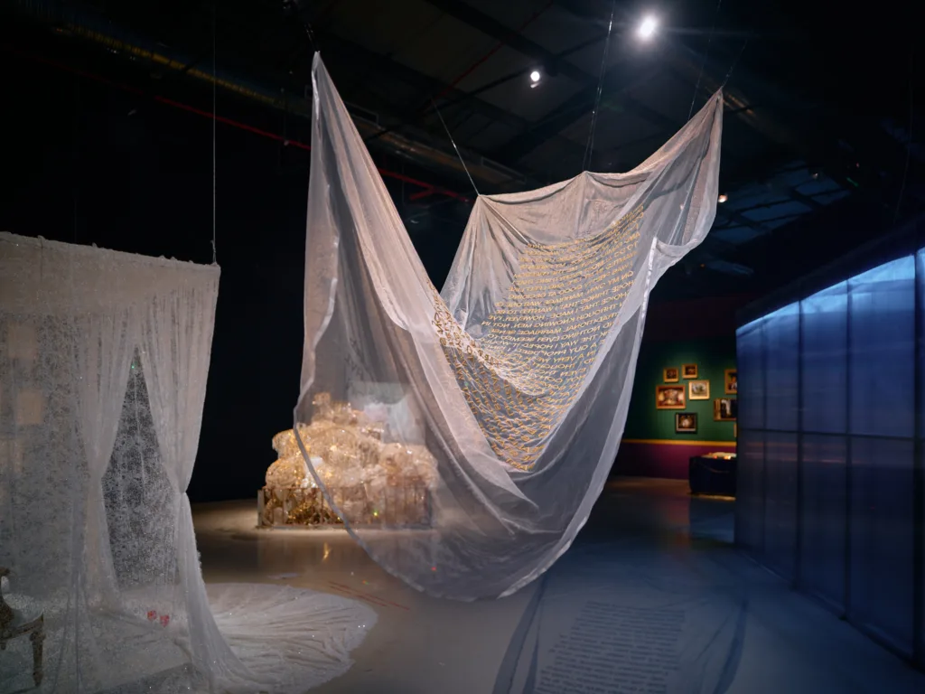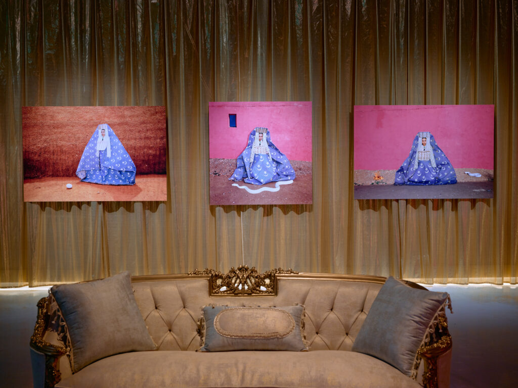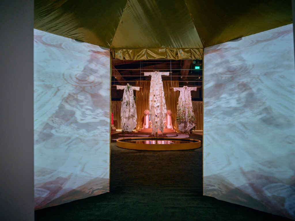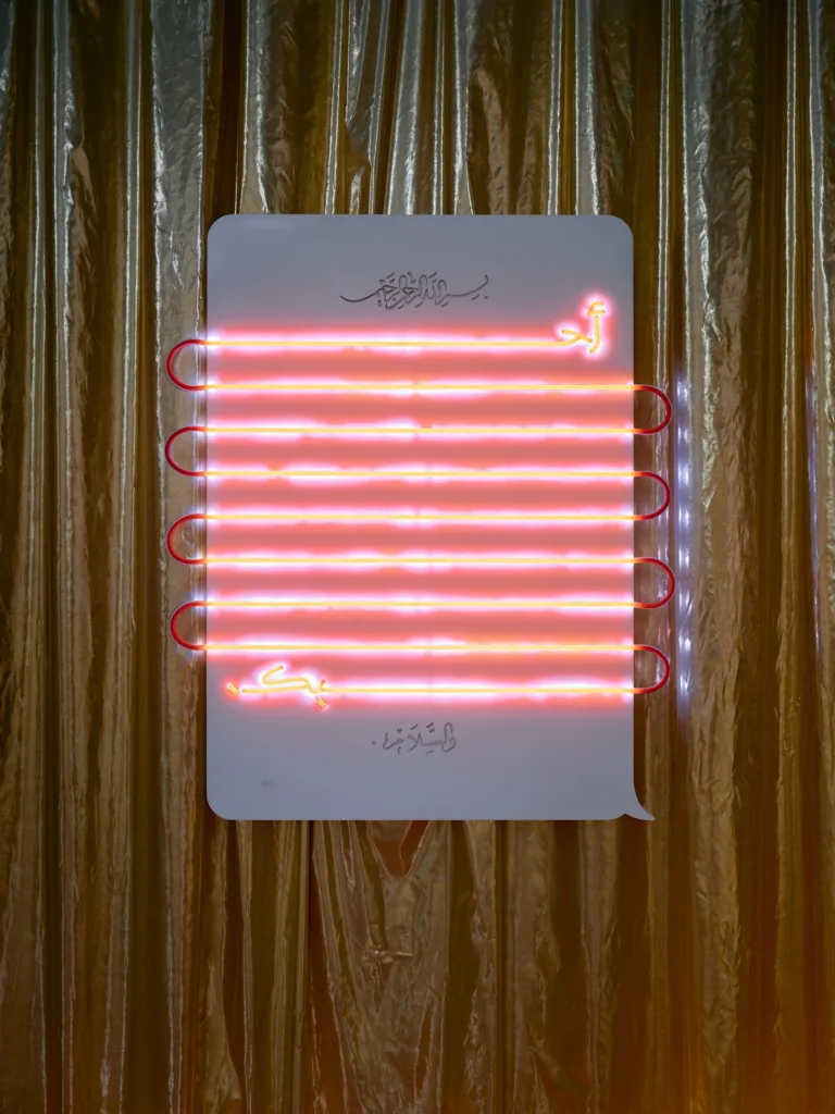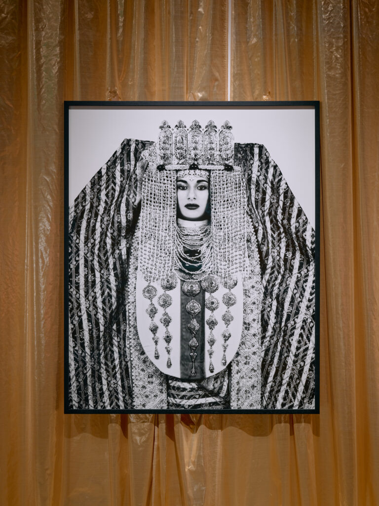 The central piece of the entire exhibition, Hearts, Bear Witness, is a surreal, AI-like, heart-shaped rendering of the ceremonial Kosa, cast in a Y2K baby pink, complete with exaggerated floral pillars as protective guards. Created by Saudi artist Aziz Jamal, it is simply crack for the eyes, feeding a visual appetite born from slop and the debris of an internet gone rogue. It is a perfectly satiating experience for an exhibition which invites us to unashamedly celebrate the celebration. It is the wedding-maxxing, MENA-core genre we never knew we needed. The cartoonishly dreamlike stage setting actually projects onto the museum’s façade, quite literally drawing you into the pageantry, inviting all the performative angst one might feel from a real wedding stage and further blurring those lines between reality and simulation.