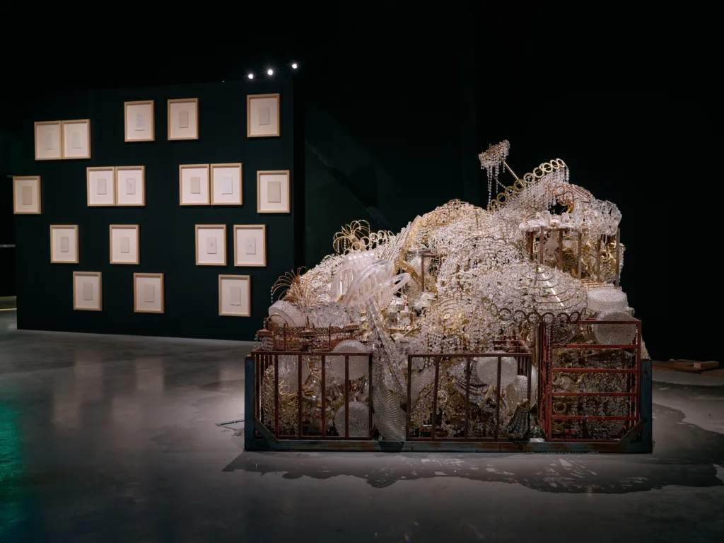 Saudi artist Sultan bin Fahd’s To Dust is another striking contribution. Fahd’s artistic tendency to rewrite cultural memory, this time in the form of a great mass of broken and entangled chandeliers which appear to have crashed out on the floor unceremoniously, adds the right amount of performance and sobriety to a space which is designed to question some broader ‘unquestionable’ cultural approaches. The installation, rather than emitting, draws in the light, creating an overspilling spectacle of gratuity, poignantly contained in a golden embossed cage.