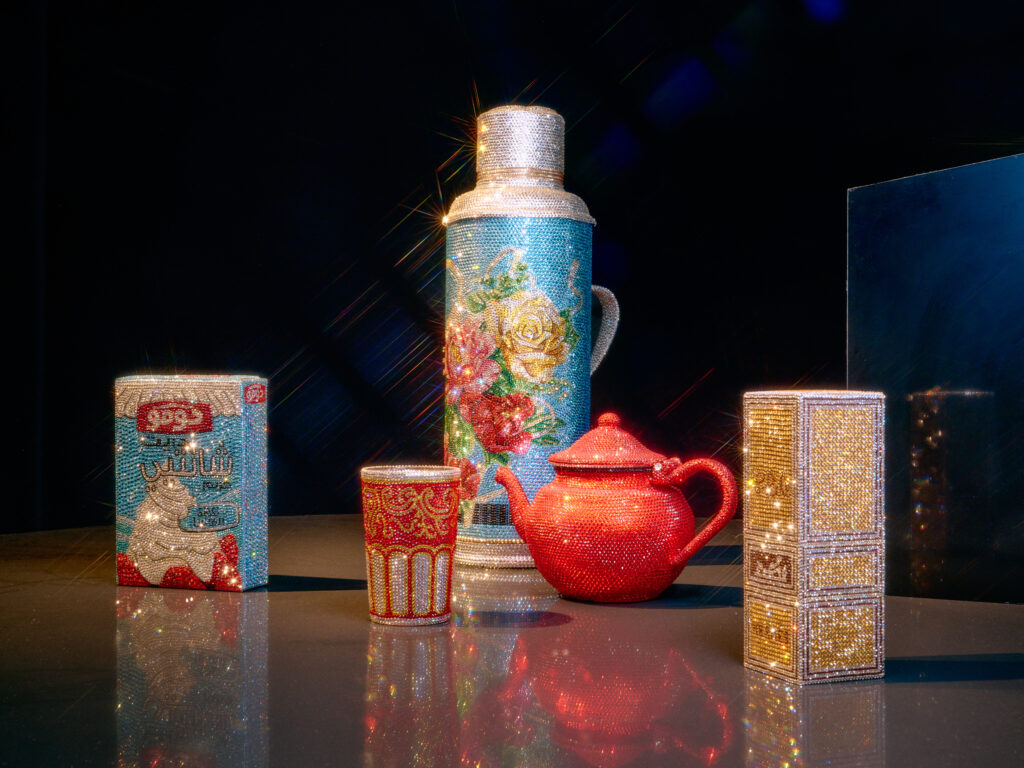 The finale of this succession of artistic events is the fittingly opulent Le Trousseau by French Tunisian jewellery designer and artist Shourouk Rhaiem, which, as its name suggests, consists of a litany of domestic objects, though unexpectedly, encrusted with Swarovski crystals. Placed in a darkening chamber, Rhaiem intended for the changing effect of the light to convey the contrast between image and reality – the objects oscillate between the extraordinary and mundane, highlighting the contradictions perceived in domestic life. A fitting end to the exhibition, it calls into question the various changes in economics and gender dynamics, and broader feeling of disillusionment, that are leading the charge away from marriage, in very different ways and at different paces, both at home and abroad.