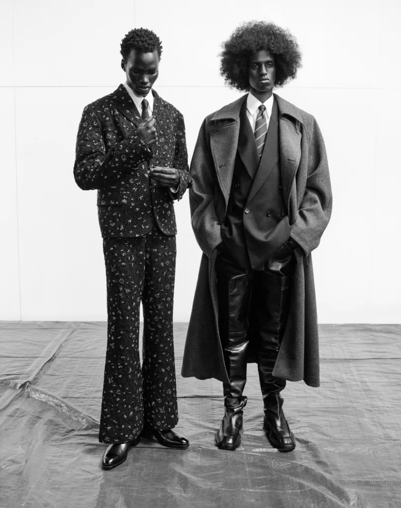 Abdi wears coat, suit, tie, shirt, boots SAINT LAURENT