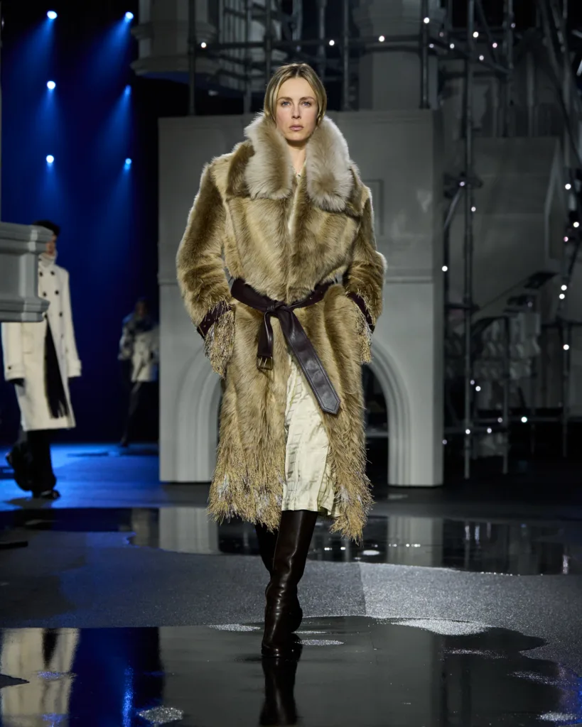 That pragmatism ran through the clothes. Bomber jackets, furs, textured leathers and puffers worn with the London underground map worn proudly on the chest. Trench coats thrown over silk slips felt less like styling and more like muscle memory, a uniform honed by decades of navigating night buses and afterparties.