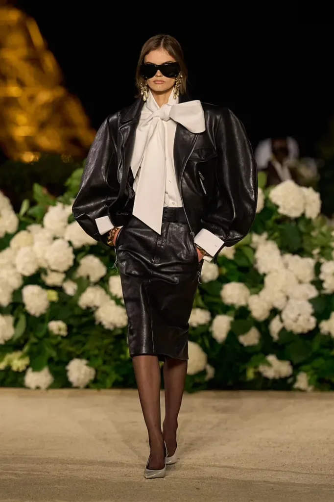Vaccarello’s 80s is hot. It’s baroque with its big bellowing sleeves and ruffles on a stream of silk dresses that glide down the runway. It’s bigger and famously better. Think baroque flourishes with the billowing sleeves, silk ruffles trailing down fluid gowns, and sunglasses that hide your face without overwhelming it. It is drama tempered with wearability โa balance that has become a Saint Laurent calling card and a formula that keeps the house at the centre of Parisโs conversation.